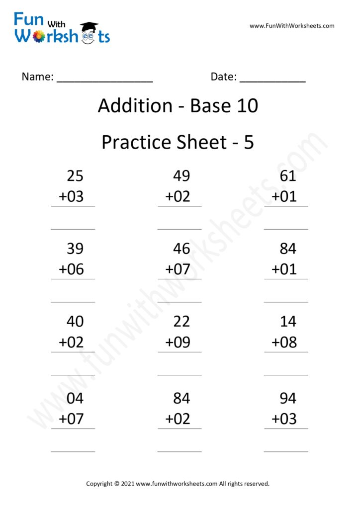 Addition Base 10 Practice Worksheets